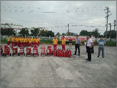 上午8:30演練準時開始,消防官兵對各種滅火器具的使用進行專業(yè)講解和操作演示。演練項目包括初起火災撲救、模擬發(fā)油臺提油車輛發(fā)油過程中著火撲救、庫區(qū)儲油大罐火災撲救,演練持續(xù)2個小時.整個演練過程指揮有力、分工明確、配合默契、實戰(zhàn)氛圍濃厚。期間,在總公司物流中心領導及油庫管理人員的陪同下,安監(jiān)局陳局長還實地察看了油庫的安全監(jiān)控系統(tǒng),詢問油庫安全生產(chǎn)工作各項措施的落實情況。